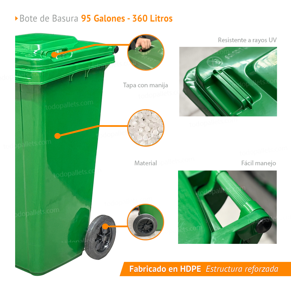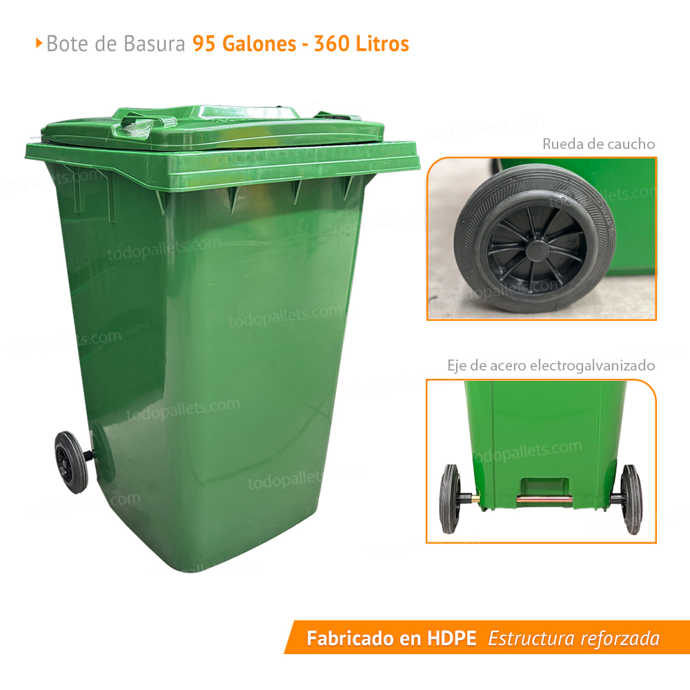 El bote de basura de 360 litros color verde con ruedas y tapa es la solución práctica y eficiente para la gestión de residuos en diversos entornos, incluyendo hogares, oficinas y espacios comerciales. Su capacidad de 360 litros lo hace ideal para manejar una cantidad considerable de desechos sin necesidad de vaciarlo constantemente.