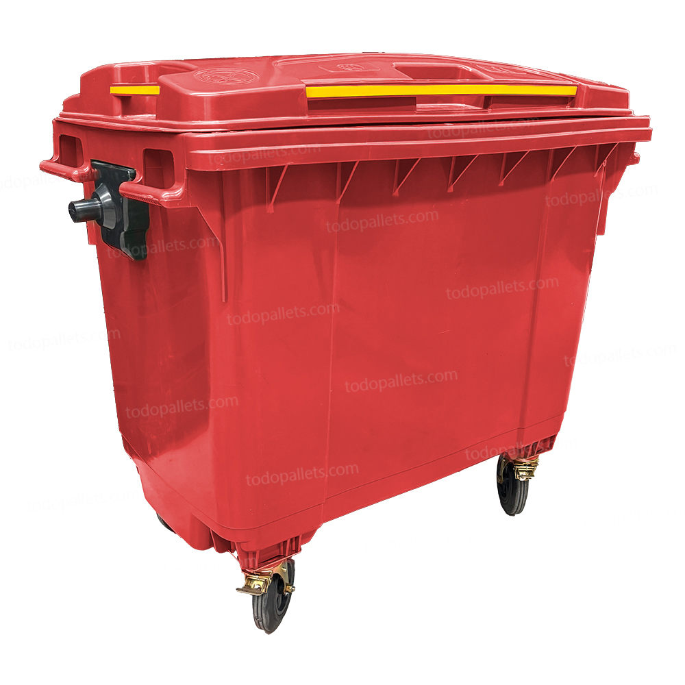 El contenedor de basura de 660 litros en color rojo con tapa y cuatro ruedas de goma es ideal para gestionar grandes volúmenes de residuos en espacios de alto tráfico como almacenes, bodegas, hoteles, restaurantes y cocinas industriales.