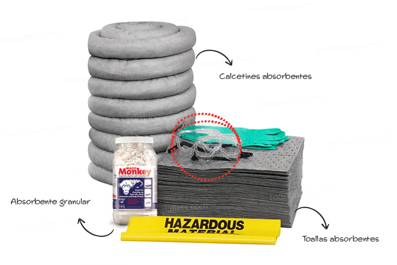 El contenido del kit está diseñado para absorber eficientemente una amplia gama de líquidos, lo que lo hace ideal para su uso en áreas propensas a derrames de sustancias químicas peligrosas. Incluye toallas absorbentes, calcetines absorbentes, absorbente granular, bolsas de desecho, guantes de nitrilo y goggles de seguridad, proporcionando todos los elementos necesarios para una respuesta efectiva ante emergencias. Este kit es una herramienta esencial para mantener la seguridad y el cumplimiento normativo en operaciones industriales.