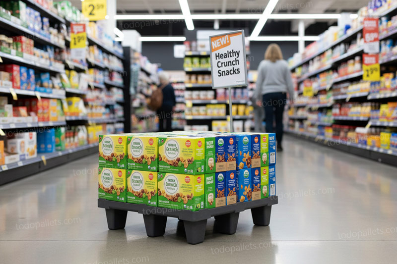 Tarima en medida especial que representa la mitad de un pallet. Comúnmente utilizada para aplicaciones en Retail o Tiendas de Autoservicio para la exhibición de productos en piso, para aplicaciones en exportación o almacenaje. Reduce costos y optimiza el espacio de almacenamiento gracias al diseño anidable, cuenta con bordes de seguridad de 5 mm.Tarima de exportación o uso interno en bodega; ligera y anidable, medidas 80 x 60 (medio pallet de plastico); reduce costos y optimiza espacio de almacenamiento.